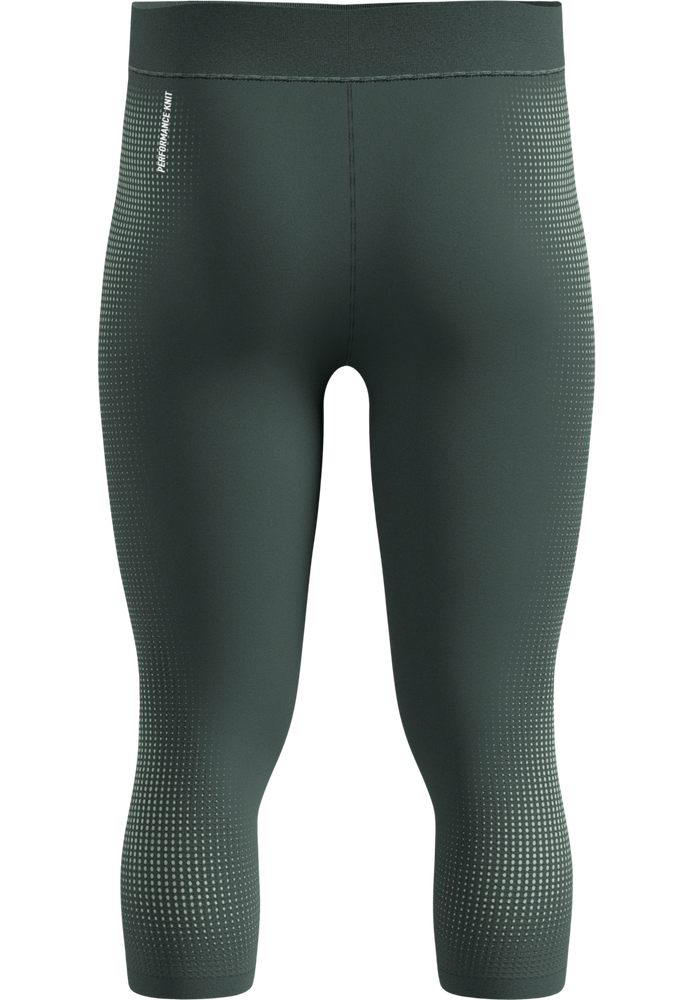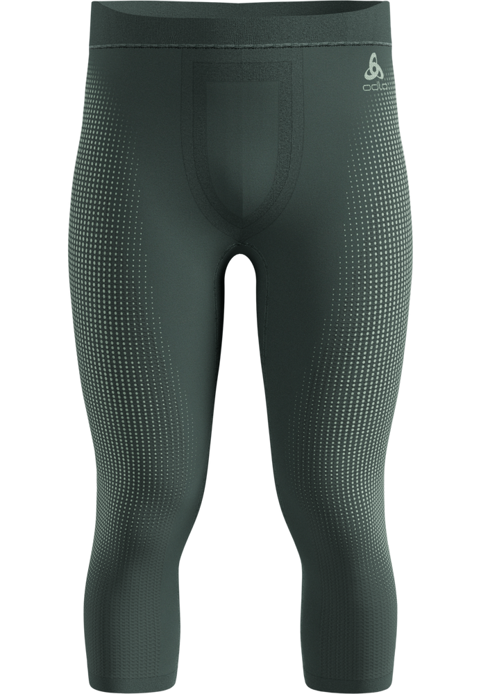 ODLO Performance Warm 3/4 men's pants, made from recycled fibers, provide 360° freedom of movement, effective moisture wicking, and odor protection thanks to ZeroScent technology, ideal for winter alpine adventures.