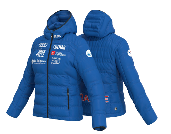 Quilted jacket in light ripstop nylon with external water repellent treatment, garment that will be worn by the athletes of the French Ski Federation for the FW23 season, enriched with precious embroidery. The soft Evodown padding makes it ideal as a thermal garment to be worn on all winter outdoor occasions from the walk in the woods, to cross-country skiing, snowshoeing or to combine with a shell jacket as an intermediate layer.