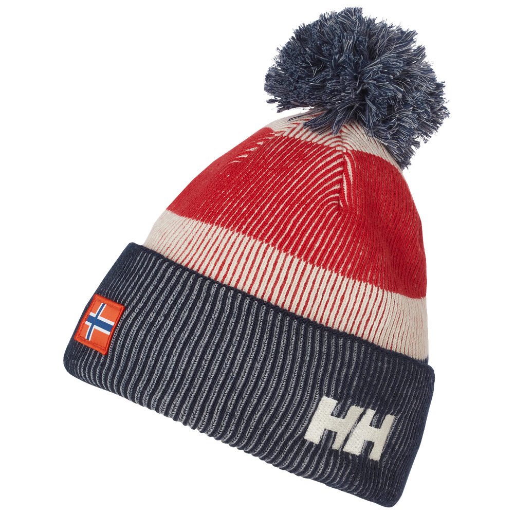 • A knitted cap designed to keep you warm during your favorite outdoor activities. It has the colors of the Norwegian flag and a retro aesthetic.